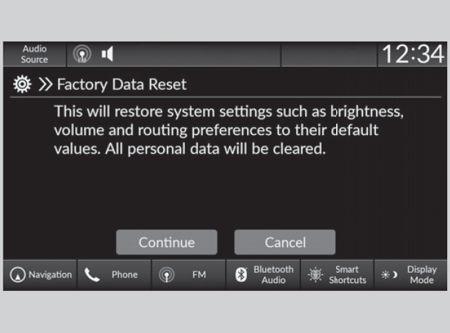 When you transfer the vehicle to a third party, reset all settings to default and delete all personal data.If you perform Factory Data Reset, it will reset the preinstalled apps to their factory default.If you perform Factory Data Reset, you cannot use the HondaLink® because it goes offline.