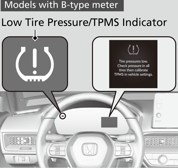 - This will cause the low tire pressure/TPMS indicator to come on and a message to appear on the gauge.