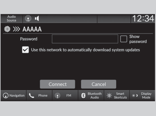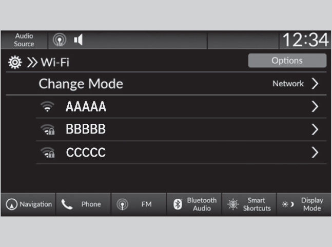 You cannot go through the setting procedure while the vehicle is moving. Park in a safe place to set the audio system in Wi-Fi mode.Some cell phone carriers charge for tethering and smartphone data use. Check your phone’s data subscription package.Check your phone manual to find out if the phone has Wi-Fi connectivity.You can confirm whether Wi-Fi connection is on or off with the