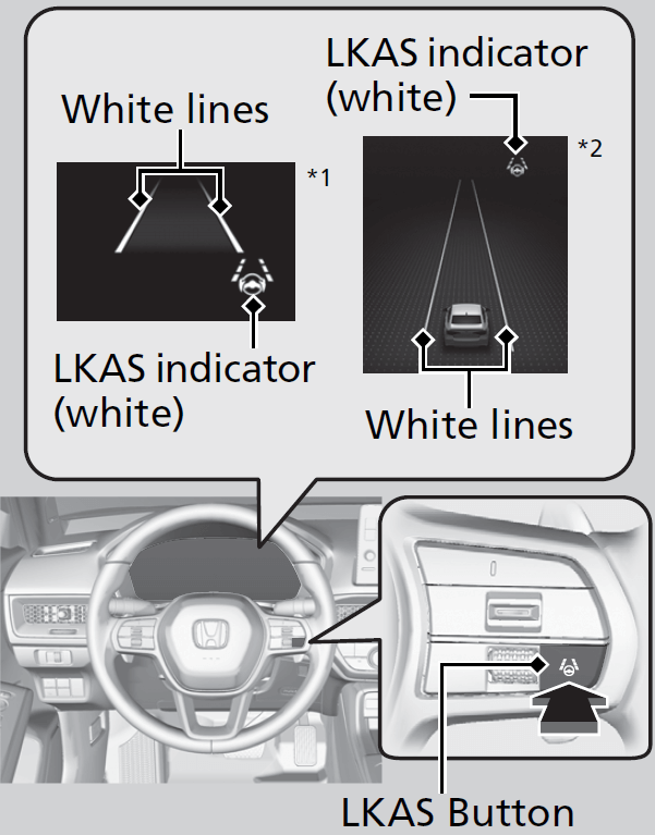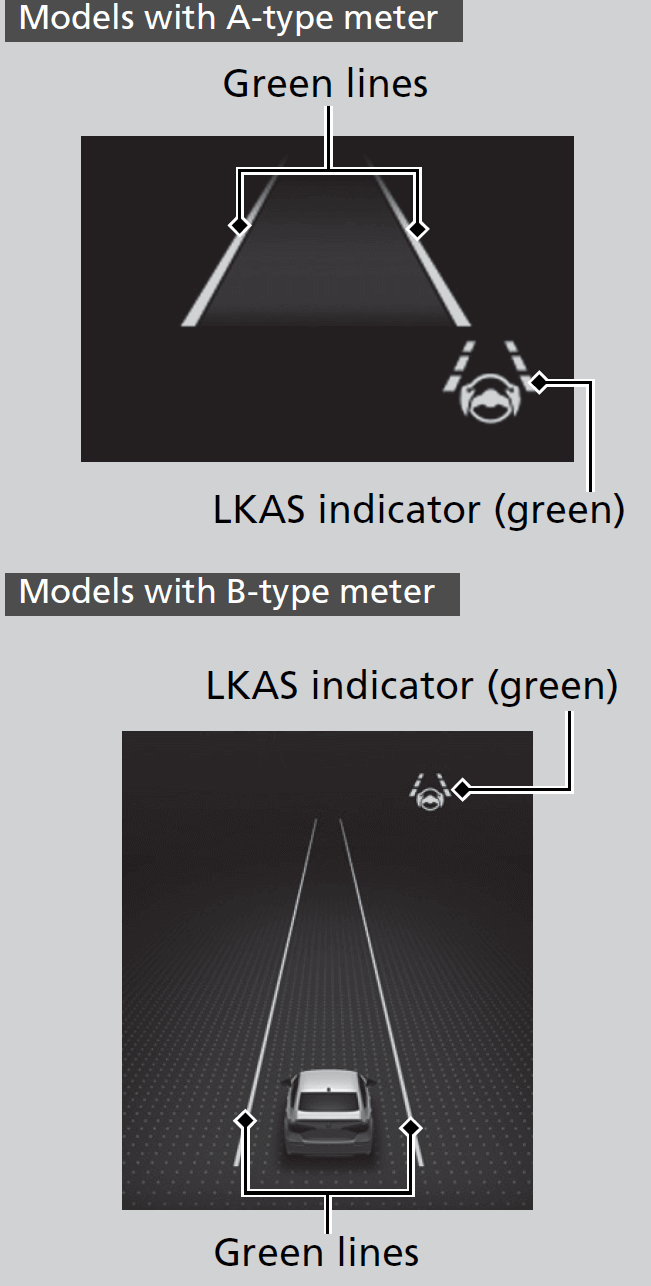 - The LKAS indicator changes from white to green, and white lines change to green once the system starts operating after detecting the left and right lane markings.