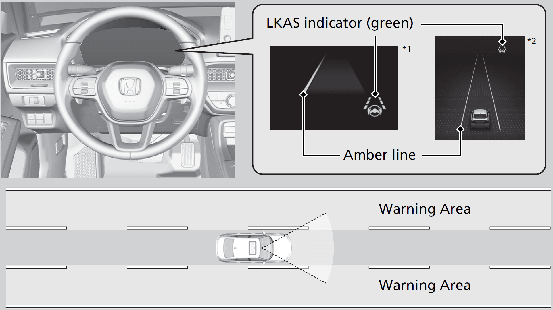 When the vehicle enters the warning area, the LKAS alerts you with slight steering wheel vibration as well as a warning display.