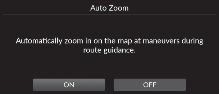 - ON (factory default): Sets the map to zoom in automatically according to the distance of the next guidance point.