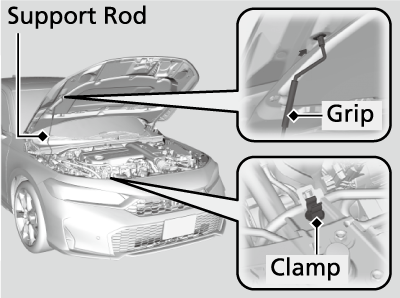 When closing, remove the support rod and stow it in the clamp, then gently lower the hood. Remove your hand at a height of approximately 12 inches (30 cm) and let the hood close.