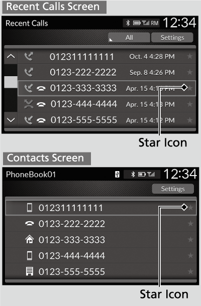 On the Recent Calls or Contacts screen- Select the star icon.