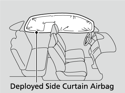 To get the best protection from the side curtain airbags, occupants should wear their seat belts properly and sit upright and well back in their seats.Do not attach any objects to the side windows or roof pillars as they can interfere with the proper operation of the side curtain airbags.If the impact is on the passenger’s side, the passenger’s side curtain airbag deploys even if there are no occupants on that side of the vehicle.If the SRS control unit senses that your vehicle is about to rollover, it immediately deploys both side curtain airbags and activates the seat belt tensioners for the front seats and outer rear seats.