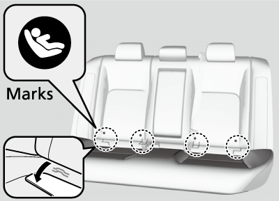 For your child’s safety, when using a child seat installed using the LATCH system, make sure that the child seat is properly secured to the vehicle. A child seat that is not properly secured will not adequately protect a child in a crash and may cause injury to the child or other vehicle occupants.Installing a LATCH-compatible child seat in the rear center seatEach outer rear seat is equipped with a pair of lower anchors which are used to secure a LATCH-compatible child seat. The rear center seat, however, is not equipped with anchors of any kind. The inner and outer anchors are spaced apart at a standard distance of 11 inches (280 mm). The distance between the two inner anchors is 15 inches (380 mm).