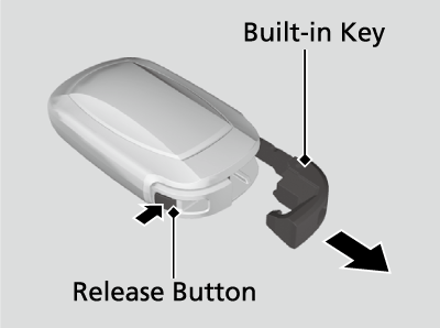 To remove the built-in key, push the release button and then pull out the key. To reinstall the built-in key, push the built-in key into the keyless remote until it clicks.