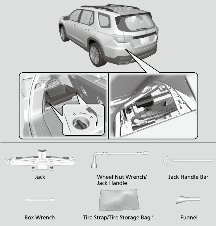 The tools are stored in the cargo area.