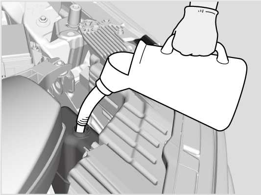 Pour the fluid slowly and carefully so you do not spill any. Clean up any spills immediately; they can damage components in the engine compartment.