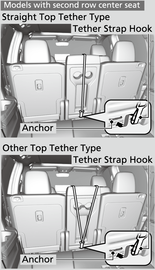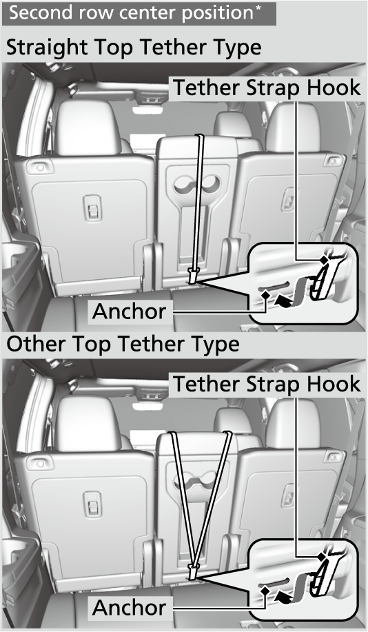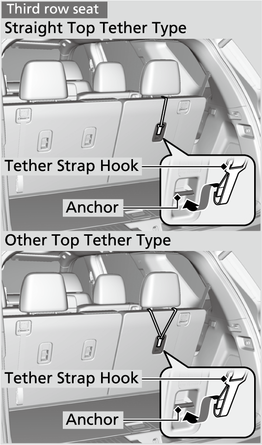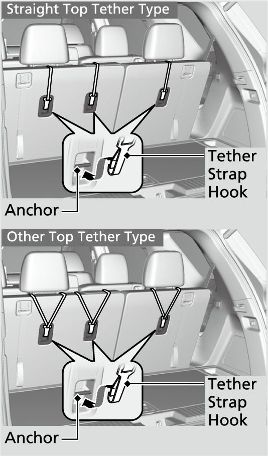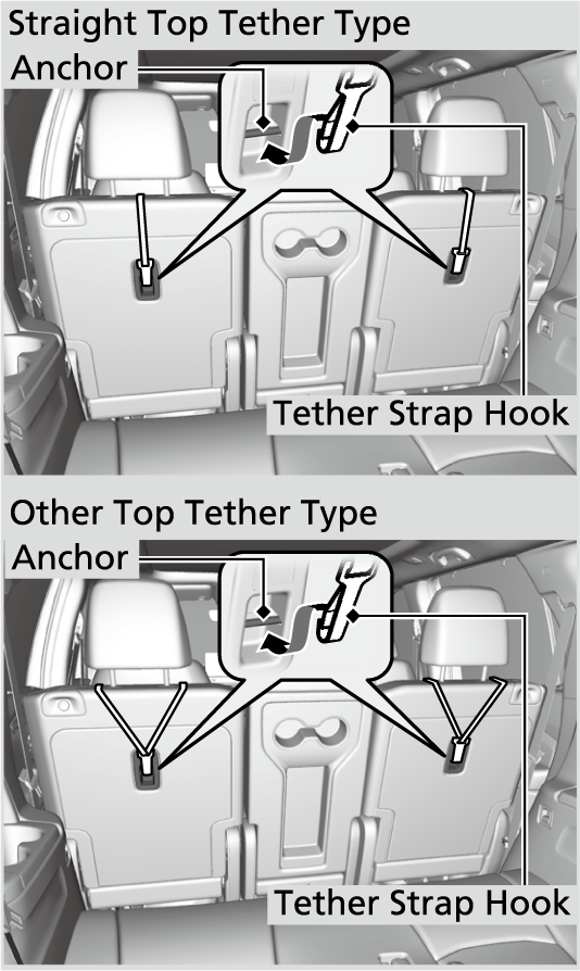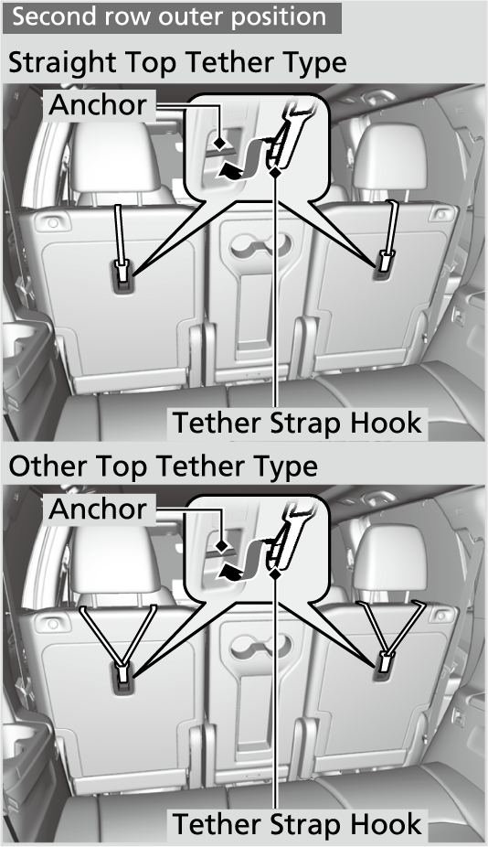 Outer positionsStraight Top Tether Type- Raise the outer head restraint to its highest position, then route the tether strap between the head restraint legs, and secure the tether strap hook to the anchor. Make sure the strap is not twisted.