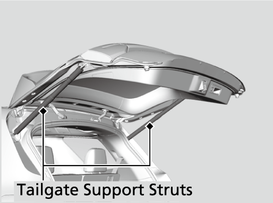 Be careful not to hit your head on the tailgate or to put your hands between the tailgate and the cargo area when closing the tailgate.When you are storing or picking up cargo from the cargo area, or by using a forward and back kicking motion under the center of the rear bumper for hands free access*, while the engine is idling, do not stand in front of the exhaust pipe. You may get burned.Do not allow any passenger in the cargo space. They may get hurt during hard braking, a sudden acceleration, or a crash.Make sure cargo or other items do not touch the tailgate support struts.