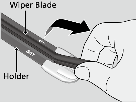 - Pull the end of the wiper blade in the direction of the arrow in the image until it is out of the holder’s end cap.