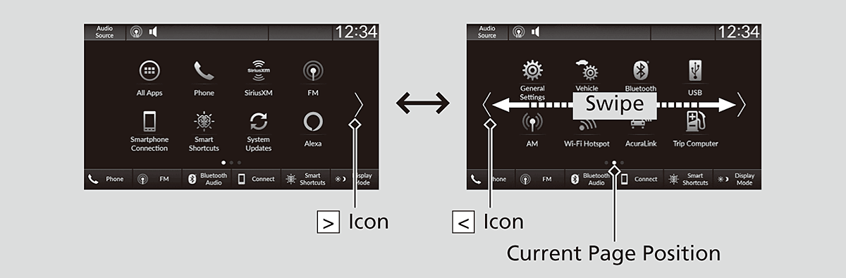Selecting < or >, or swiping the screen left or right changes to the next screen.