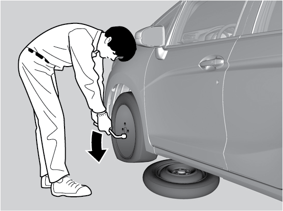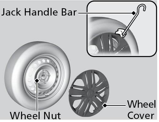 For models with a wheel cover, put the flat tip of the jack handle bar into the edge of the wheel cover and carefully pry the edge up to remove the cover.