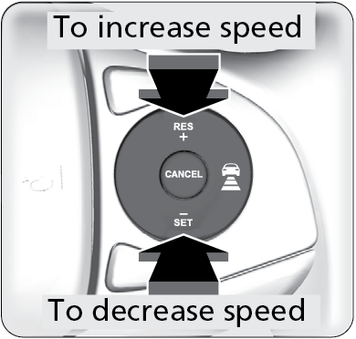 Press the RES/+ button to increase speed or the SET/- button to decrease speed. Each time you press the button, the vehicle speed is increased or decreased by about 1 mph (1.6 km/h). If you keep the button pressed, the vehicle speed increases or decreases by 5 mph or 5 km/h until you release it.